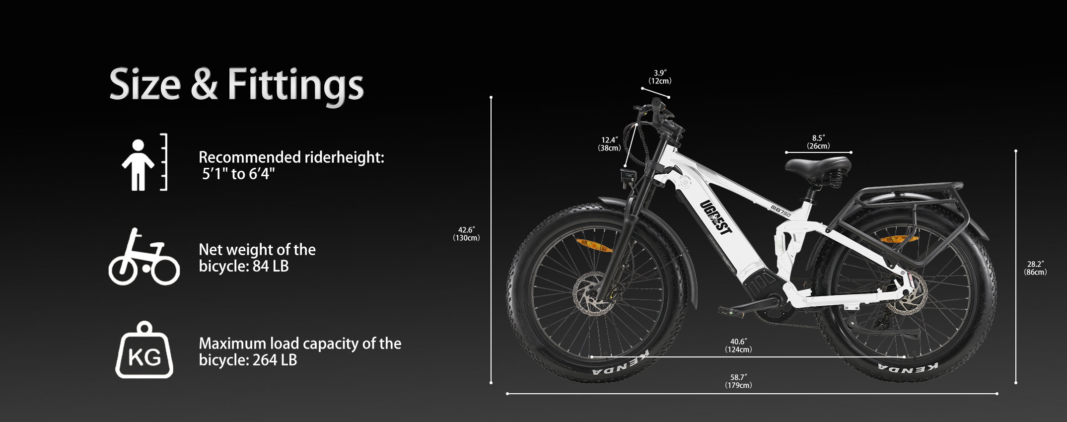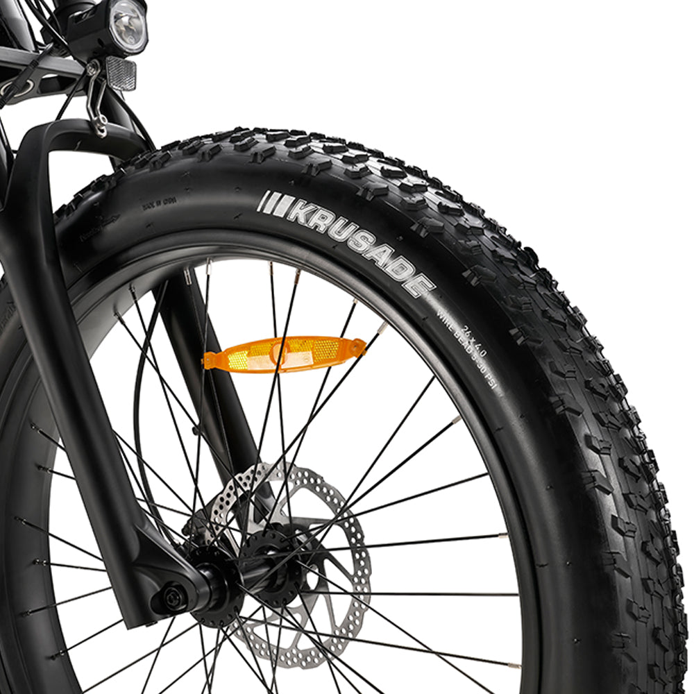 All-Terrain Fat Tires – 26" × 4.0" Kenda tires for stability on sand, snow & gravel.